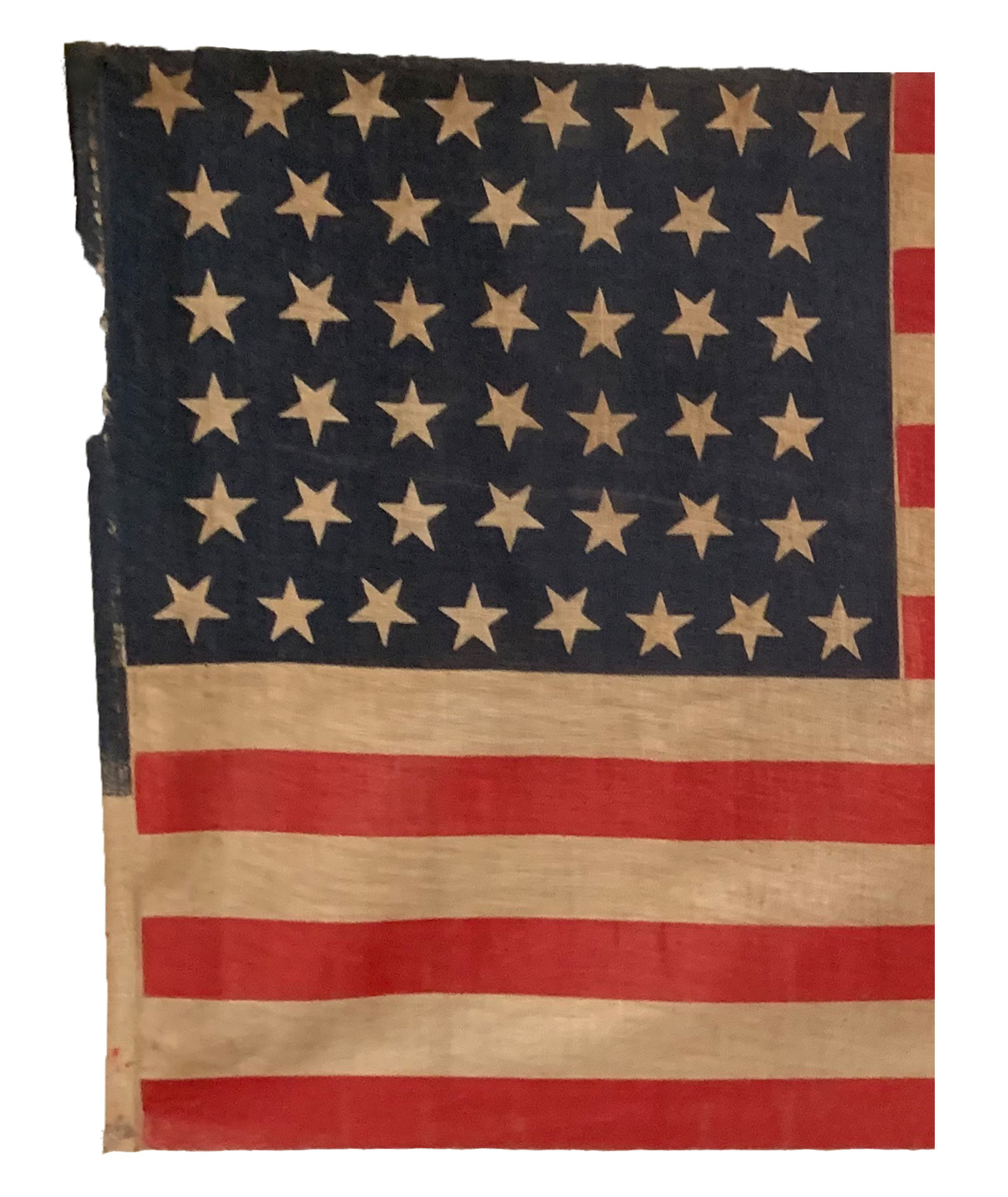 44 Stars printed on glazed cotton in a folksy arrangement flowing out onto an “hourglass” pattern; good condition for its period, the flag has an unyielding presence with it’s colors remaining strong but garnering a soft patina revealing it’s age; canton has a nice deep blue color with aged fading, a nice aged appearance- does have slight bleeding left side along the canton and several stars imprint center of the flag in the strips, light crease in the center, fly- material loss as pictured; framing process is pressure mounted using pre-washed 100% cotton (black) material over cotton batting and acid-free board; gunmetal grey frame with gold imprints gives the appearance of steel