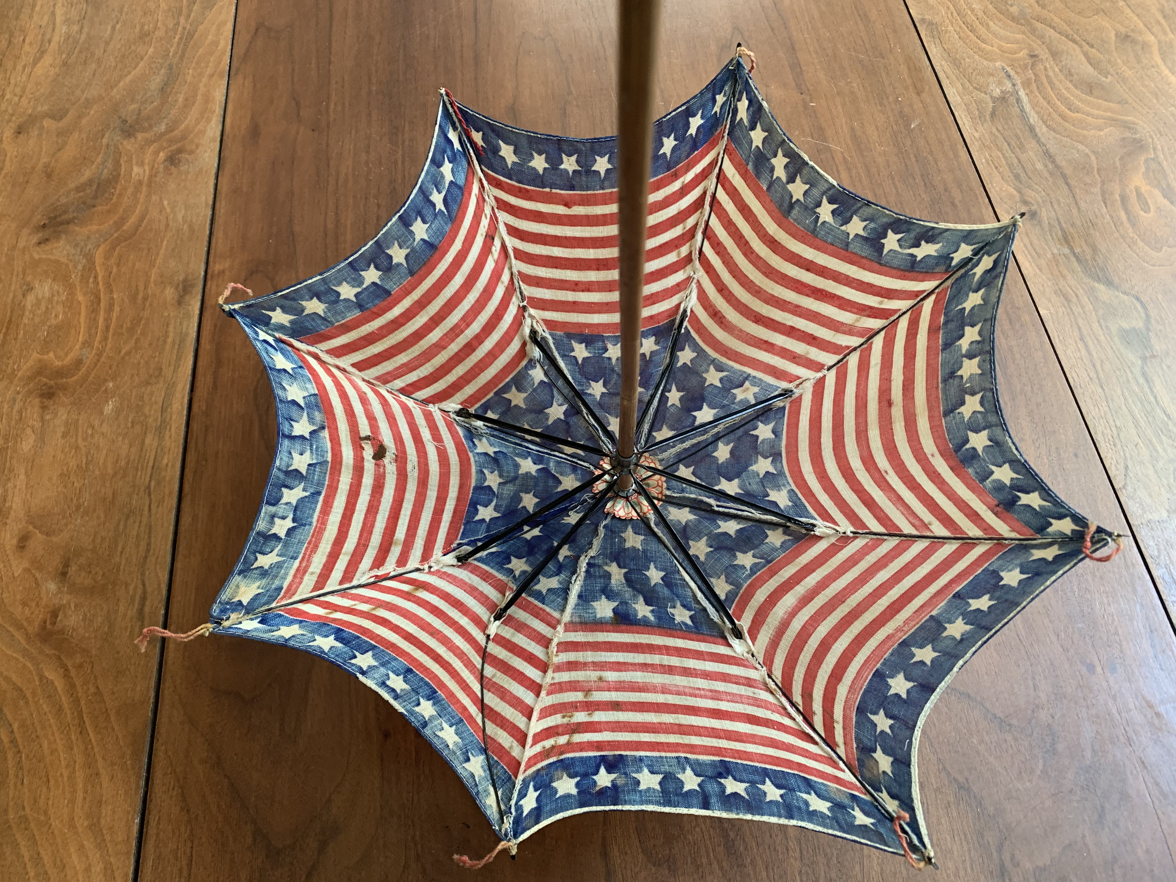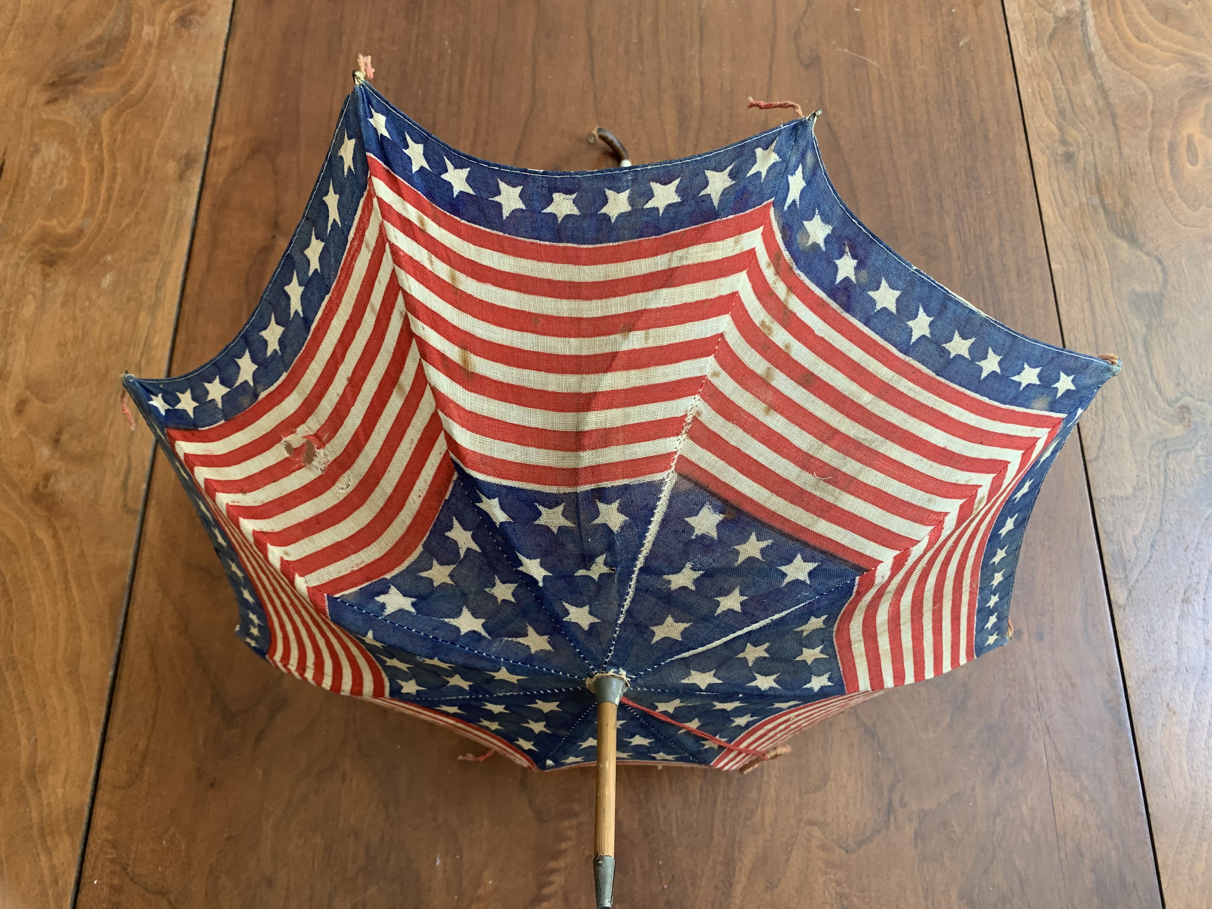 There is a small hole in the cloth as shown in image #1, missing nut connecting one rib support as shown in image #7. Overall the parasol is in great condition given its age. United States 48 star flag; 13 stars and stripes.