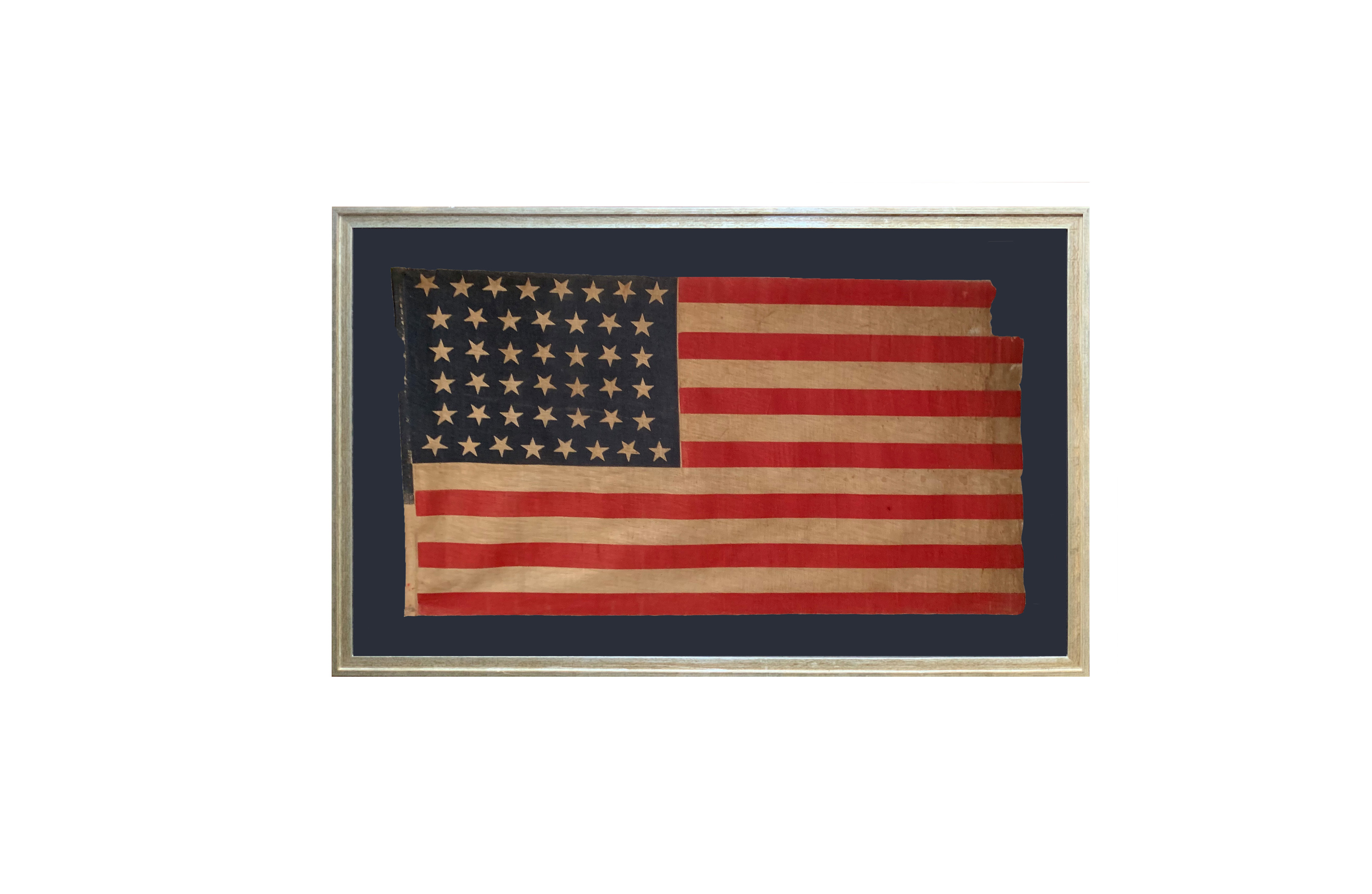 44 Stars printed on glazed cotton in a folksy arrangement flowing out onto an “hourglass” pattern; good condition for its period, the flag has an unyielding presence with it’s colors remaining strong but garnering a soft patina revealing it’s age; canton has a nice deep blue color with aged fading, a nice aged appearance- does have slight bleeding left side along the canton and several stars imprint center of the flag in the strips, light crease in the center, fly- material loss as pictured; framing process is pressure mounted using pre-washed 100% cotton (black) material over cotton batting and acid-free board; gunmetal grey frame with gold imprints gives the appearance of steel
