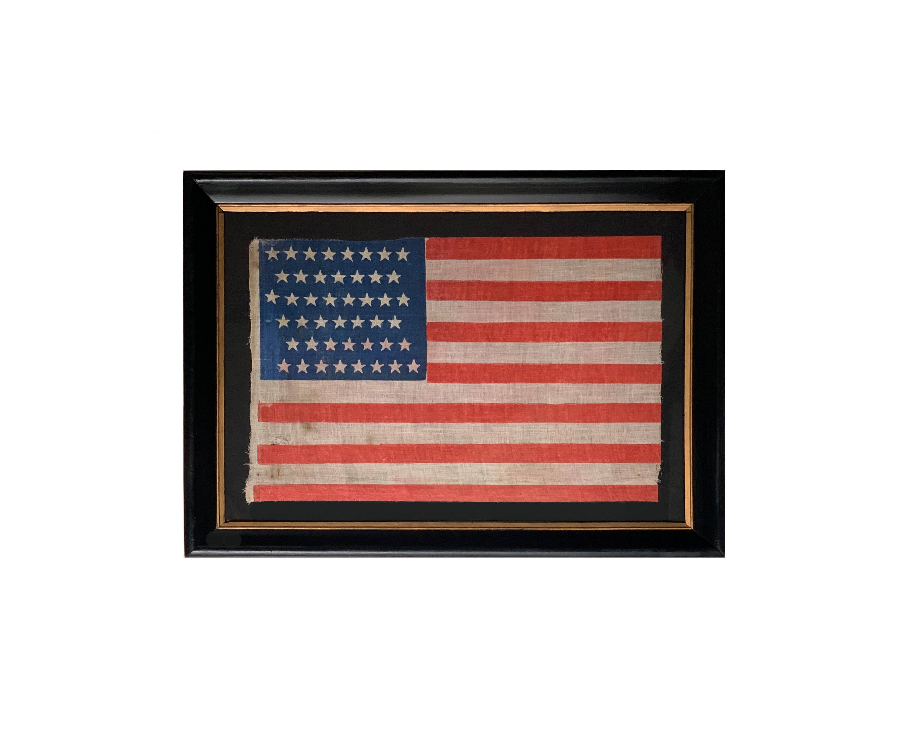 Antique 45-Star American parade flag, made of glazed cotton; the printed stars in the canton are arranged in a staggered pattern in lineal rows of 8-7-8-7-7-8, the 13 alternating red and white stripes represent the original 13 colonies. The colors are bold with a few areas containing slight discoloration, hoist and fly have some fraying, a few areas of fabric separation.