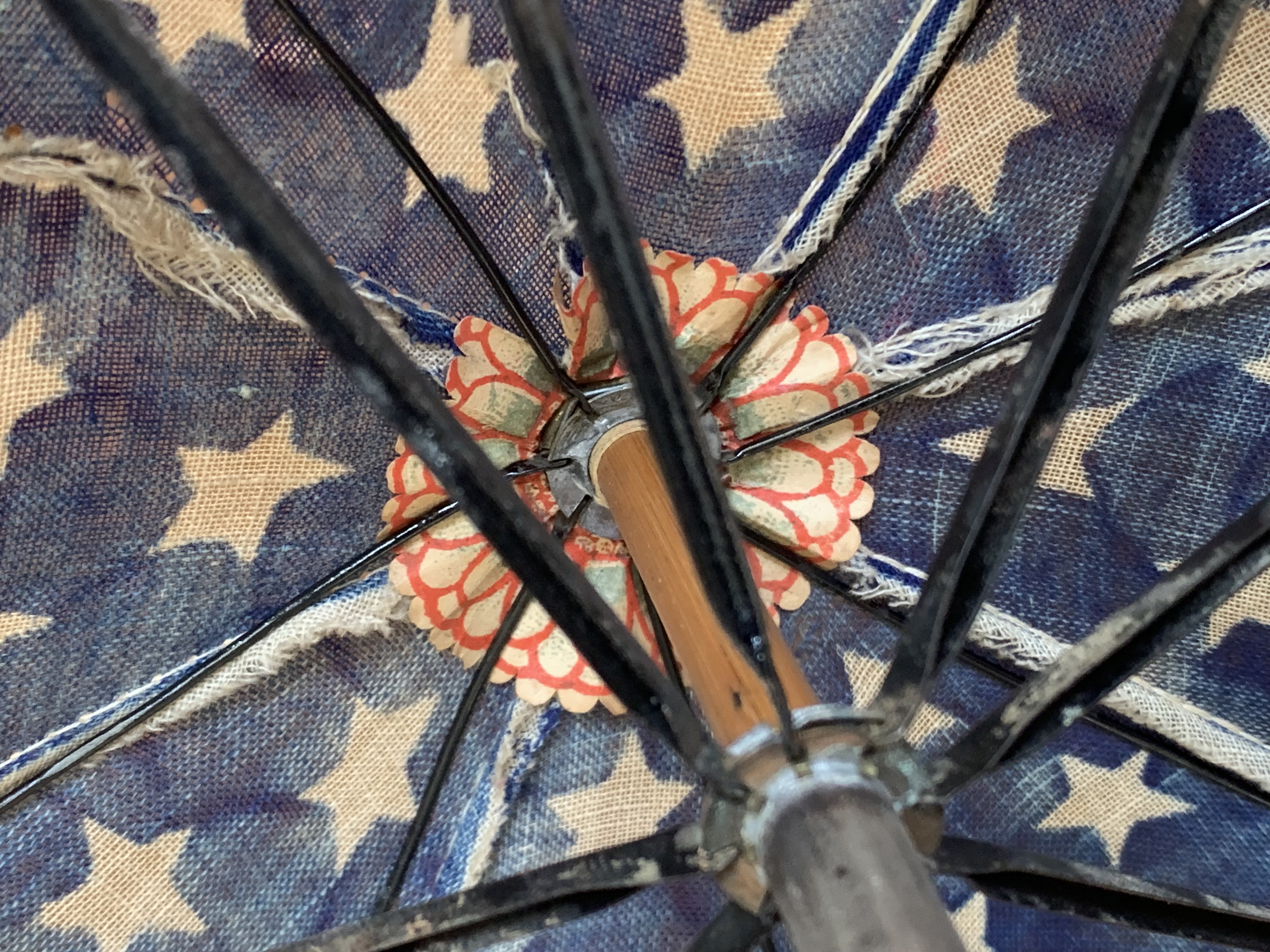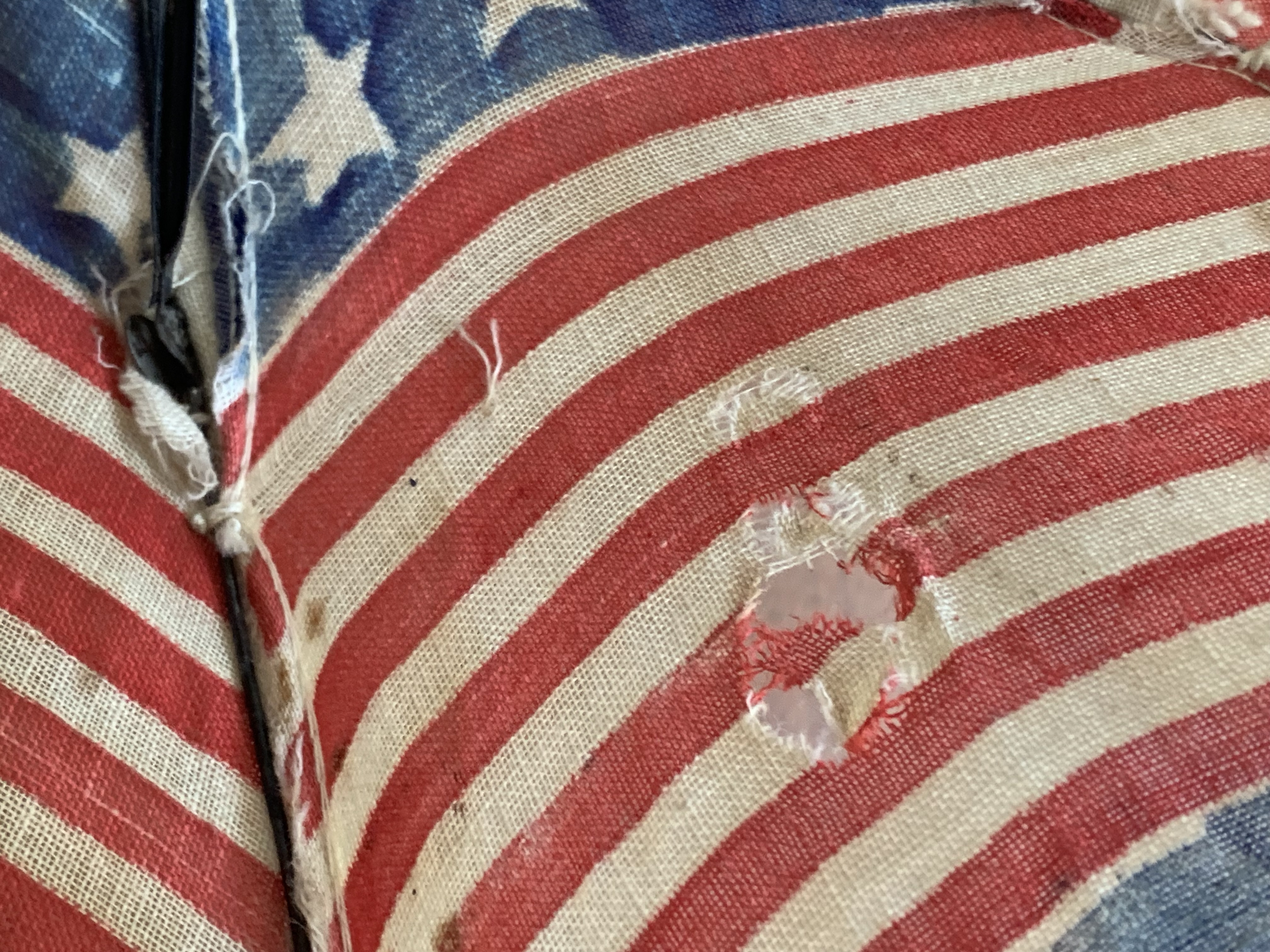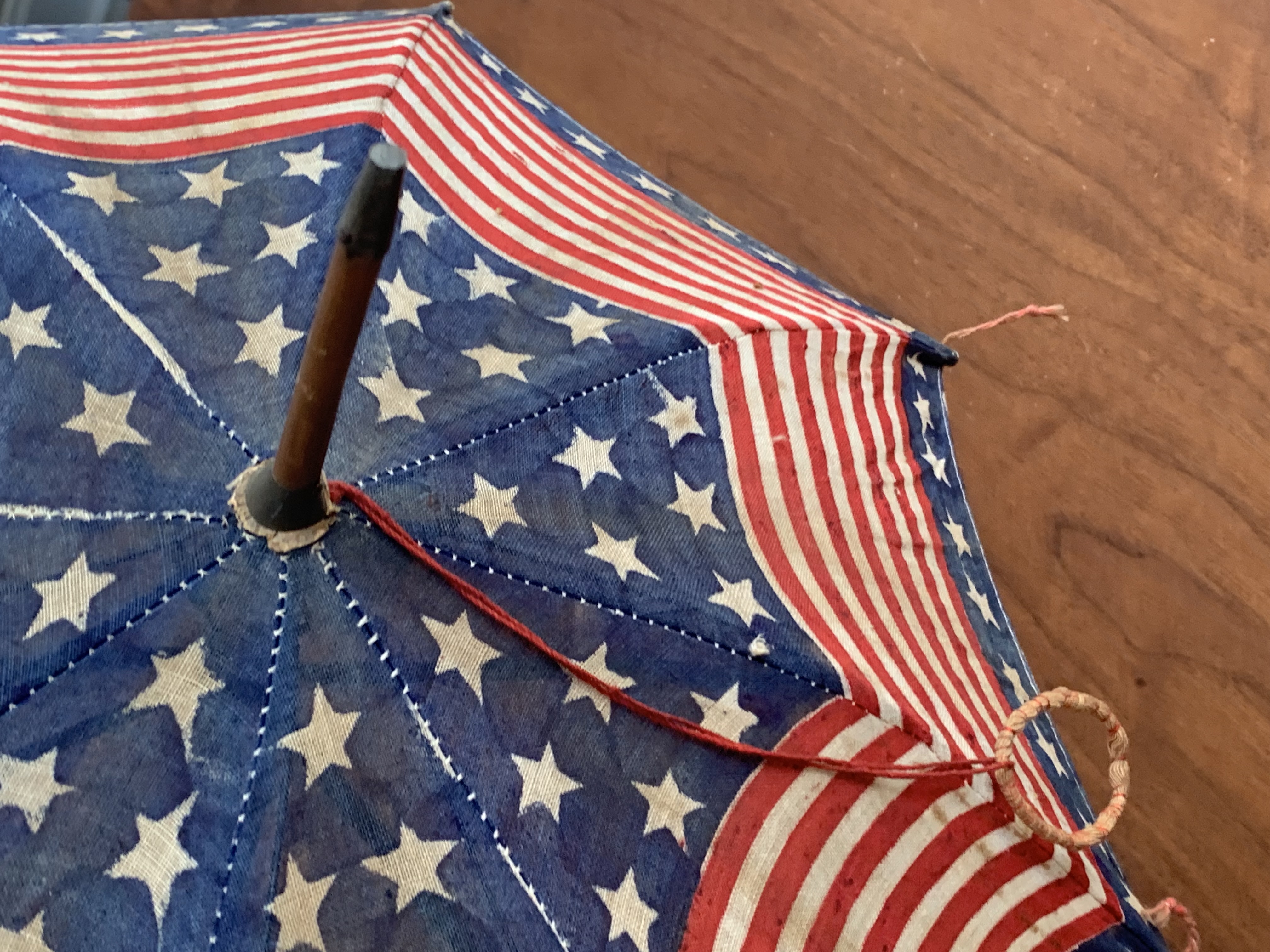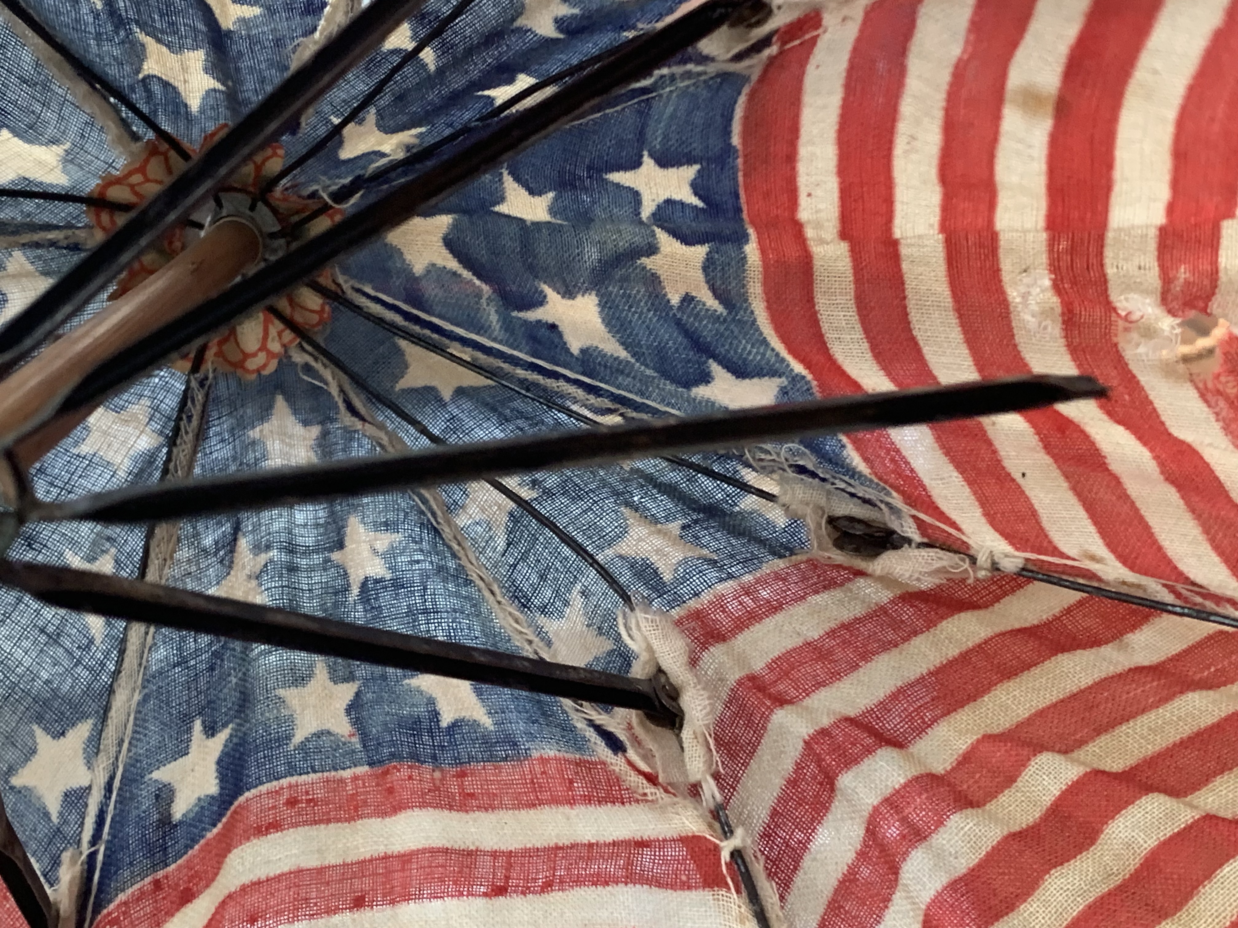 There is a small hole in the cloth as shown in image #1, missing nut connecting one rib support as shown in image #7. Overall the parasol is in great condition given its age. United States 48 star flag; 13 stars and stripes.